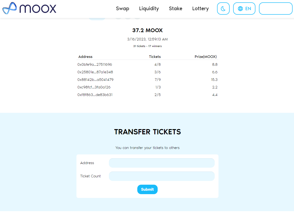 Lottery tickets can be transferred to others on Lottery page.